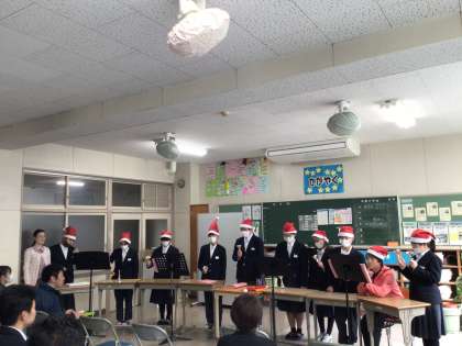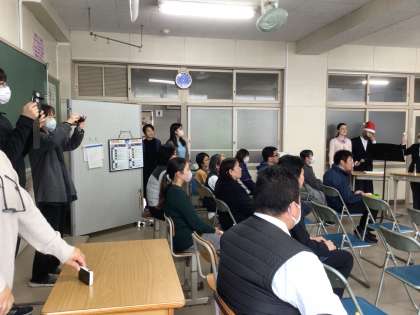 今週の月、火、水曜日の昼放課に、1、2、3学級の子たちがクリスマス発表会を行っています。発表会では音楽の授業などで練習したハンドベルの曲を2曲聴かせてくれます。今日の発表会にもたくさんの先生が聴きにきていて、写真を撮ったり拍手をしたりして温かい雰囲気でした。