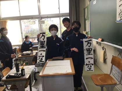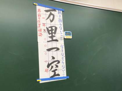 1年7組にお邪魔しました。年明けの書き初め大会に向けて国語の授業で書道の練習をしていました。書き初めの練習が始まると年の瀬が近づいてきたことを感じます。先生は、生徒が上手に字が書けるようにと練習用のプリントを準備していました。このプリントの上に半紙を置いてなぞって練習すると字の形がよくつかめるようです。作品を披露してくれたふたり、ありがとう。のびやかでいい字ですね。次回の練習もがんばりましょう!