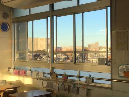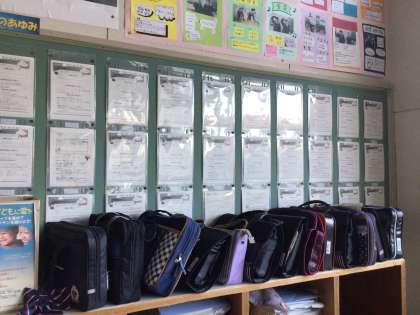 校舎を歩いて拾った朝の風景です。一枚目、心遣いを感じる窓の開け方と綺麗にかけられた雑巾。美しいです。2枚目は1年生教室で拾った風景、並べて置いてあった書道用具。今日も書道の授業がありますね。良い字が書けるといいですね。
