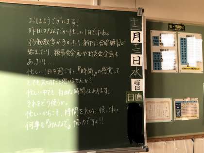 3枚目は2年生教室で拾った風景です。生徒を近くで見ている担任ならではの視点でいつも黒板日記が綴られています。誰もいない教室でチョークを手に黒板に向かう先生の姿が目に浮かびます。
