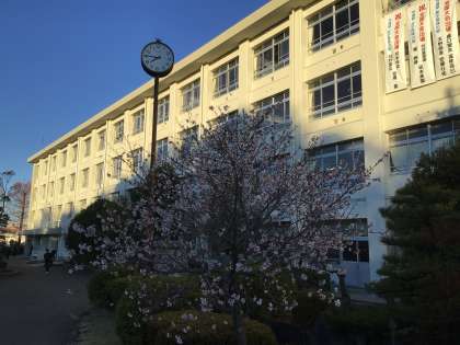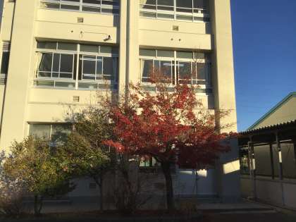 2枚目は正門近くの四季桜。3枚目は1年7組の教室前にあるもみじの写真です。朝日に照らされた真っ赤な紅葉が美しいです。