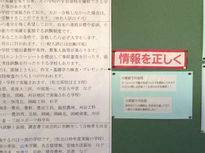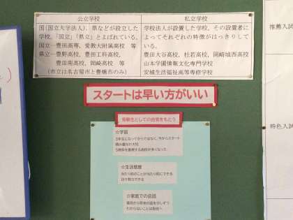 2年生の学年掲示板です。先日の自然教室説明会の折に進路指導主事から話があった内容が掲示されています。早めの準備と正しい情報。3年生への進級が4か月後に迫っています。そろそろ義務教育後の自分の進路について考えてほしい時期です。