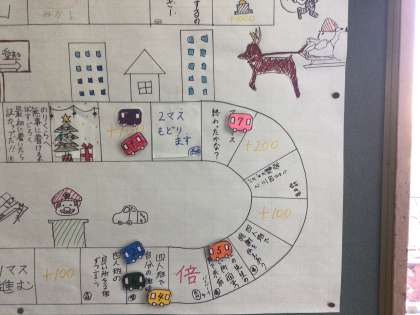 級長会が作った「乗鞍への道」のすごろく。乗鞍に向けて出発した7台のバスが少しずつ進んでいますね。