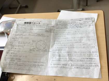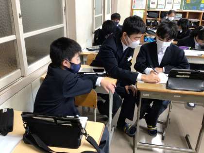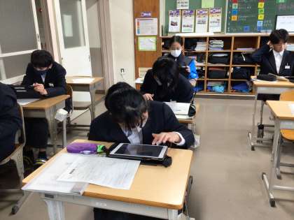 写真は1年3組です。1年生は今、総合的な学習の時間を使って職業調べを行っています。生徒のタブレットを覗かせてもらったところ、自分が興味のある職業について、発表ノートでプレゼンを作っていました。また、調べたことをまとめるワークシートは、A3の大きさの紙にびっしりと書きこんでいる生徒が多かったです。1年生の皆さん、良い学びをしていますね。