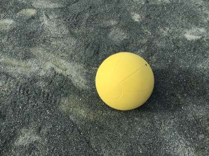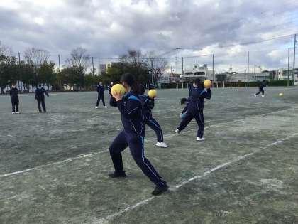 生徒が使っているのはメディシンボールと呼ばれるもので、体を鍛えるために用いるトレーニング器具の一種です。見た目はドッジボールそのものですが、中には砂や砂鉄などが入っており、持ち上げるとずっしり重いです。生徒たちは先生の指導を受け、ちょうど砲丸を投げるようなフォームでステップを踏み肩から腕を前に押し出すようにして投げていました。写真は2年1組です。