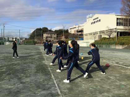 5時間目の2年生体育の様子です。風がさすように冷たい中、2年1組と2年2組が体育を行っていました。