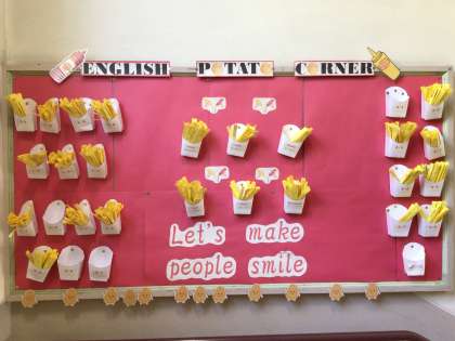 階段の踊り場にある英語の掲示板です。カラフルで内容も工夫されています。英語に親しむ生徒が育つと嬉しいなと思って先生たちがコツコツ作ってくれたのでしょう。フライドポテトの掲示板には、生徒たちが「親切」「礼儀正しい」「おもしろい」など友達の良いところを見つけて名前を書いた紙をどんどん入れていました。工夫された掲示物です。