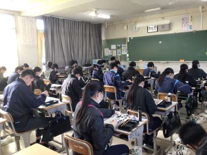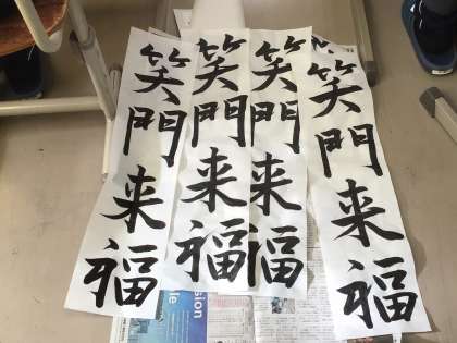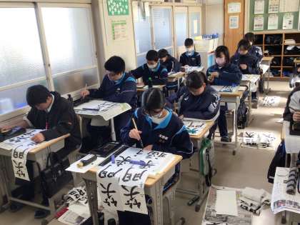 2年生の書き初めの文字「笑門来福」は、文字通り「笑う門には福来る」ですね。明るい気持ちで今年も頑張っていきたいものです。半紙に向かって黙々と筆を運ぶ生徒の姿がありました。