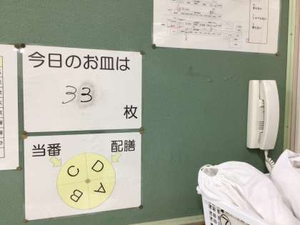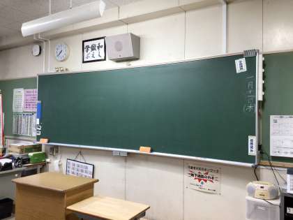 綺麗に揃えて開けられたトイレの窓、美しい黒板。今日のお皿の枚数は33枚。給食当番が助かる掲示物の工夫。今日の献立は和食メニューです。