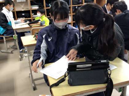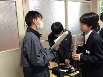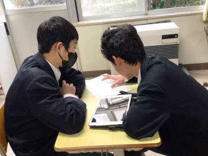 今日は各自が作成したスピーチを友達に聞いてもらって時間や内容についてアドバイスをしあっていました。タブレットで時間を計りながらスピーチを磨き合う生徒の様子です。