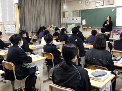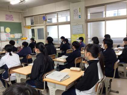 1年4組の理科の授業です。2月に控えている学習診断テストの目的や意義について先生が話をしていました。真剣な眼差しで聞く生徒たち。学習診断テストは、学習内容について理解度を見るものであることや、今勉強していることは3年生になっても大事になる内容であることなどを先生が話していました。時々頷きながら話を聞いている生徒が何人もいました。気持ちをしっかりと向けて聞いていることが表情や様子からわかります。すばらしいです。