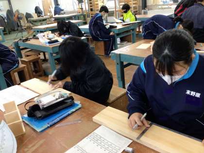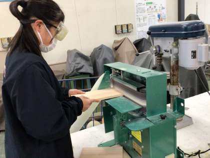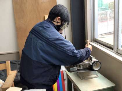 ノコギリで切ったあとは、切り口を滑らかにするために電動ヤスリで表面を削ります。安全のためのメガネをはめています。こういうのは大事ですね。安全第一。