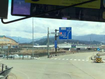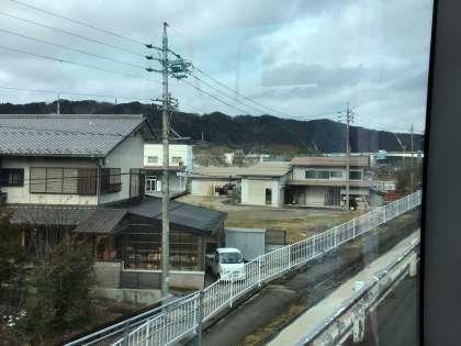 高速道路を下りました。市街地にはあまり雪はありません。今から山に向かってバスを走らせます。遠くに雪を被った乗鞍岳が見えました。
