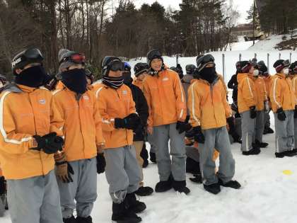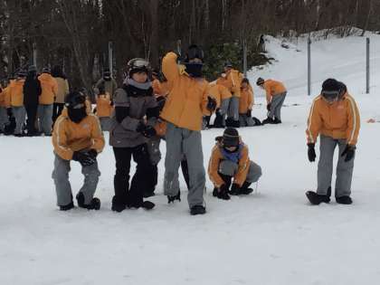 雪玉当てリレー。どのクラスが一番にゴールするか!