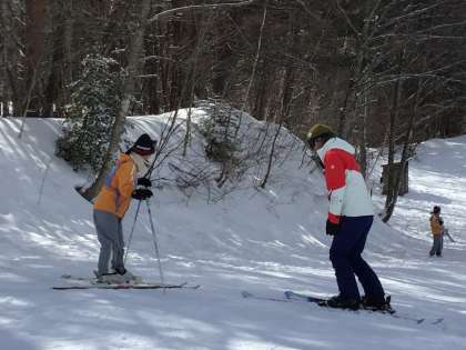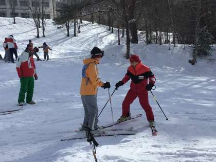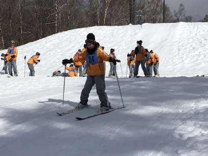 午前の実習の様子です。インストラクターさんたちが本当に親身になって教えてくださっています。一つのグループの人数は8人程度。午前午後、それぞれ2時間ずつの実習です。初心者は緩斜面でハの字をしっかり作り、重心が後ろに行かないように何度も練習していました。午前の2時間でかなり上達しました。