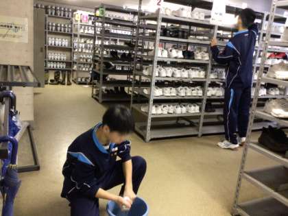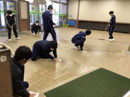 朝の集いの後の清掃の様子です。広い館内を分担して清掃します。所員の方から「しっかり清掃に取り組んでいますね」とお褒めの言葉をいただきました。疲れた顔もせず頑張る生徒たち。素晴らしいです。