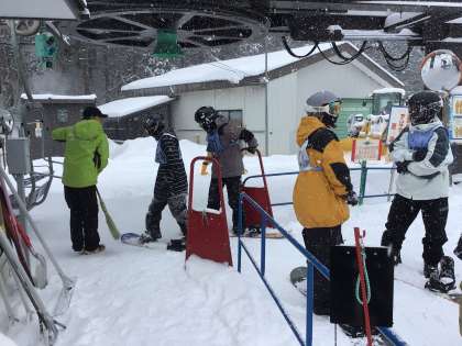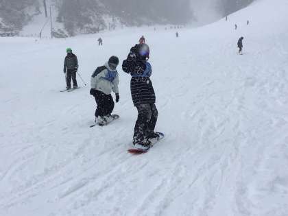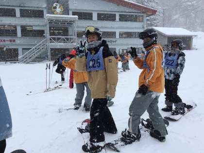 「雪が最高」「転んでも痛くないです」とスノボの生徒たち。滑りを楽しんでいます。