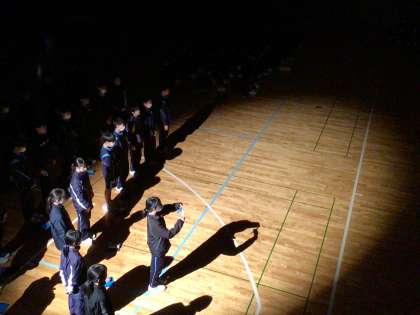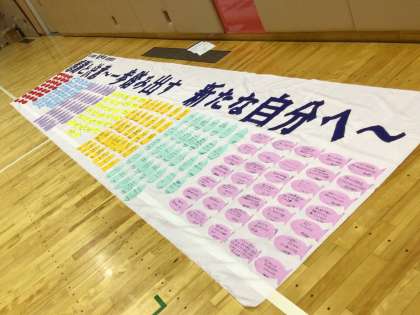 生徒が決意を述べたときに手にしていた小さな布は、集められて一つの大きな布になりました。「感謝と決意 一歩踏み出す新たな自分へ」感動的な瞬間でした。