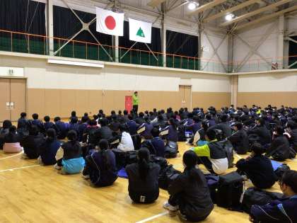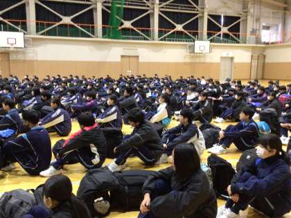 退所式の様子です。所員の方からは「ここで体験したことをこれからの生活に生かしてください。何事も自分で体験することが大切です」とお話をいただきました。代表してお礼を述べた生徒は「コロナ禍で小学校のキャンプが中止になった私たちにとって、今回の自然教室は貴重な体験になりました。施設を使わせていただいてありがとうございました。」と4日間を振り返って気持ちを伝えていました。