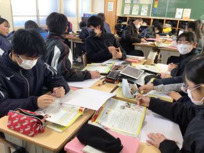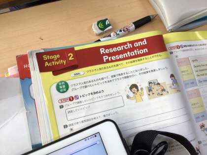 2年生の英語の授業の様子です。単元は「リサーチ&プレゼンテーション」、班ごとにテーマを決めてアンケートをとり、グラフなどにまとめてプレゼンテーションをします。テーマはゲーム、寿司、アニマル、音楽、スタディ、睡眠などさまざまです。タブレットでプレゼン用のグラフを作っている班もありました。