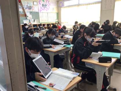 真ん中の写真は英語の授業です。生徒たちは教科書の英文をタブレットに向かって読んでいます。タブレットで録音した音声はタブレット上で先生にデータ提出します。先生は一人一人の音声データを聞いて評価します。