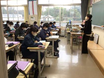 2枚目と3枚目の写真は2年6組の理科です。低気圧と高気圧、上昇気流などについて学習していました。今日のお天気も、低気圧や前線の影響で今一つですね。
