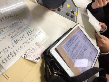 DJ?(生徒会長)とゲストは事前にしっかり打ち合わせができているのでしょう、細かい字でびっしり書き込まれたメモが手元に置かれていました。忙しい中、今日のために、また全校生徒のために時間を割いて準備してくれたことがよくわかります。手書きのシナリオを写真に撮ってタブレットで見ている生徒もいます。いかにも今どきの生徒らしいです。使いこなしてるな!と思いました。