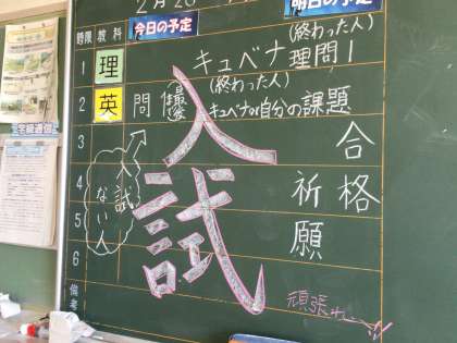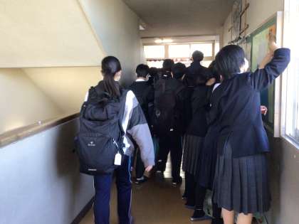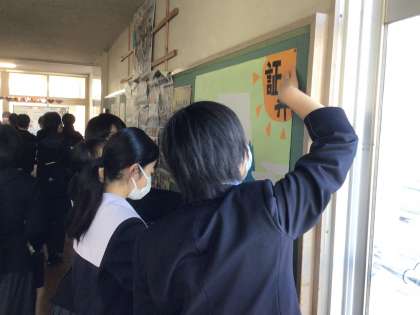 朝の登校風景です。2年生の学年掲示板のリニューアルを頑張っている生徒たちがいました。