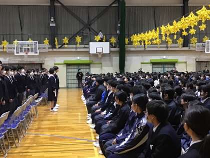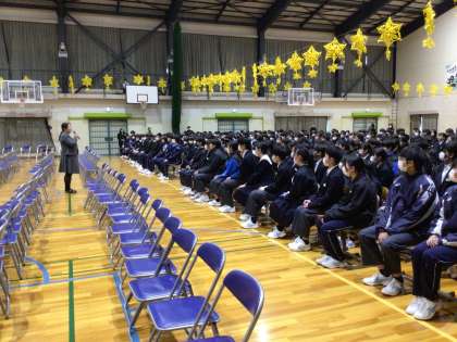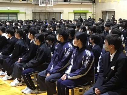 3年生が退場した後で3年生主任からも1、2年生に感謝を伝えました。体を向けて真剣な表情で話を聞く1、2年生の姿。「卒業まであと4日」そんな思いが心に溢れてくるような今日の会でした。