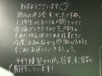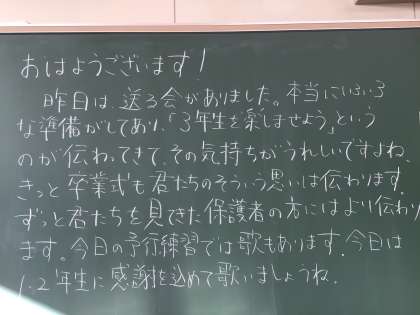 3年生の先生たちが黒板日記に昨日の卒業生を送る会について書いていました。残りわずかの中学校生活で3年生として後輩に残せることは何か考えながら1日1日を大切に過ごせるといいですね。