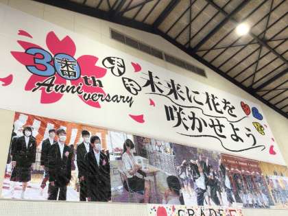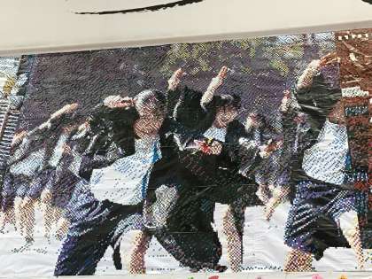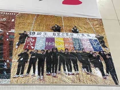 体育館の後ろに飾られている写真は1年生が作ったモザイク画です。大きな写真はよく見ると細かい四角が点々と塗られて作られています。1マス、1マス、一生懸命に塗ったものを貼り付けて一枚の大きなモザイク画に仕上げてあります。後輩からの心のこもった贈り物です。修学旅行、自然教室、体育祭‥思い出しますね。