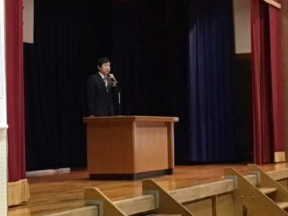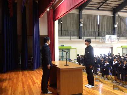 3時間目、体育館で3年生のための同窓会入会式を行いました。同窓会長は本校の10回生でいらっしゃいます。同窓会長から卒業生にお話をしていただき、その後で、代表生徒が誓いの言葉を述べました。