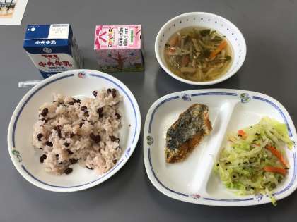 今日の給食は「卒業おめでとう献立」です。赤飯やケーキが出ました。3年生の皆さん、給食を食べるのも今日で最後になりましたね。次に給食を食べる機会があるとすれば、それは、