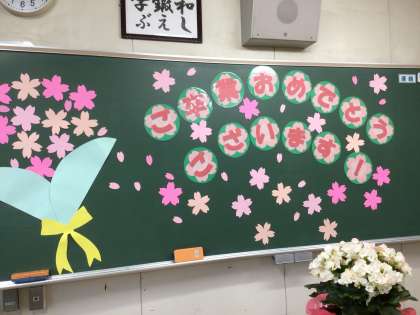 3年生が下校してから、1,2年生が卒業式の会場等の準備をしてくれました。式場の準備、廊下や階段の飾り付け、気持ちよく過ごしてもらうための清掃など、先輩のためにがんばって準備しました。在校生の皆さんの気持ちはきっと先輩たちに伝わります。
