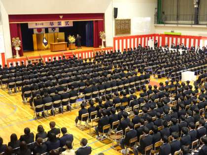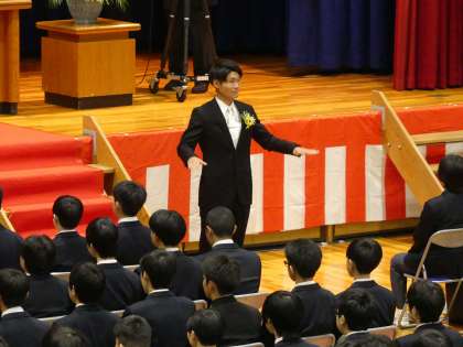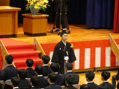 卒業生入場の様子です。在校生、職員、保護者、来賓の方に見守られておごそかに式が始まりました。全校生徒が参加しての卒業式は、平成31年3月の卒業式以来です。後輩に見守られながら39回生が卒業します。