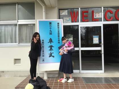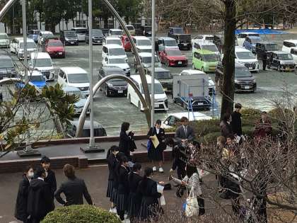 卒業生がお家の方と帰っていくときには雨が上がり、青空がのぞいていました。名残惜しそうに写真を撮るご家族がたくさんいらっしゃいました。感動的な卒業式でした。
