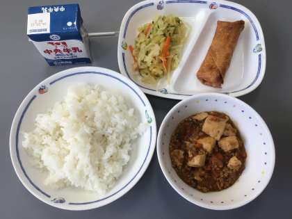 麻婆豆腐、春巻き、春雨入りサラダです。
