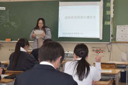 この授業では、入試制度(複合選抜、組み合わせ)進路希望調査の書き方など、今後自分たちが行っていく進路決定に向けてより具体的なことを学びました。次の学年に向けた準備が始まっています。
