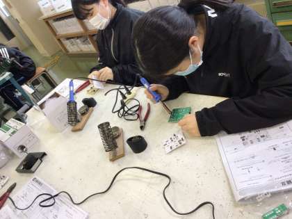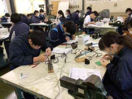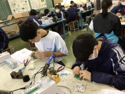 技術棟では2年2組の技術の授業が行われていました。生徒たちは、はんだごてを使って基盤に部品を取り付ける細かい作業を行っていました。自作のラジオから音が流れてきたらすごく嬉しいですよね!