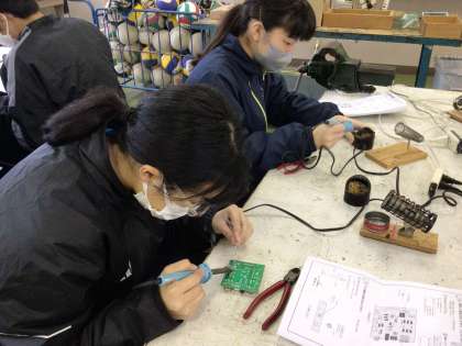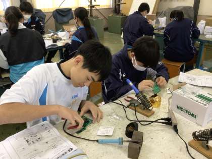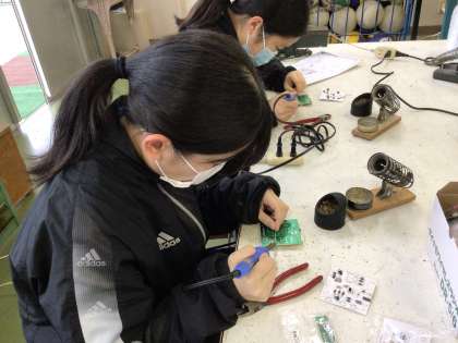 2年2組の技術の授業の様子です。ラジオ製作に取り組んでいます。小さな基盤に部品を取り付けています。とても細かい作業なので集中力を要しますね。完成を楽しみにしながら頑張ってくださいね!