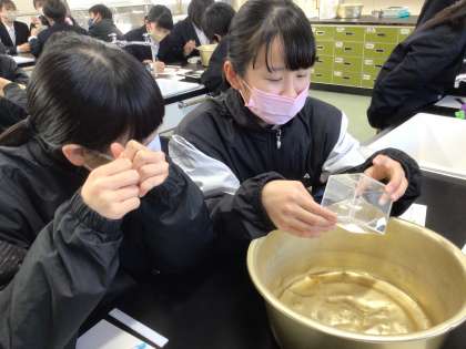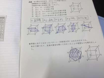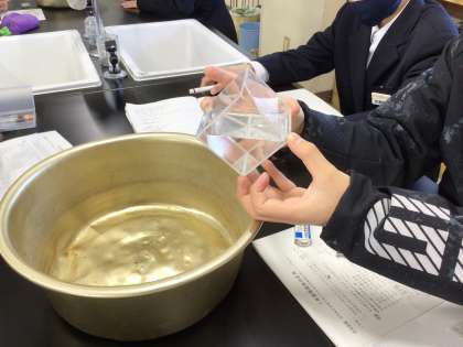 1年生の数学の授業です。今日の数学は理科室で行っています。学習内容は、空間図形の応用です。立方体の断面図について調べています。数学の先生が手作りしたアクリルの容器に水を入れて、いろいろな切り方をした時の断面の形を調べています。