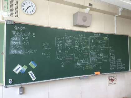 2年生教室、盛り上がっています。企画を考えたのは級長会。忙しい中みんなのために頑張りましたね。企画の内容や仕事分担が学年職員室の黒板に書かれていました。