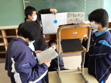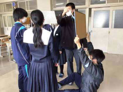学年職員室では級長たちががんばっていました。椅子に乗せたタブレットの前にボードを掲げたり、クイズを出題したりしていました。ボードをずっと持っている人は大変そうでした。みんなのために頑張りましたね。各学級の生徒が喜んでいましたよ。お疲れさまでした!