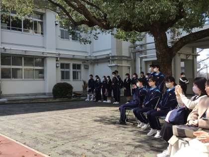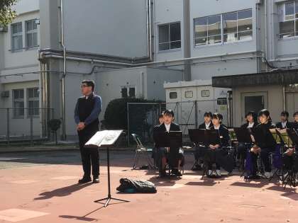 晴天の中庭で吹奏楽部が演奏会を開きました。お家の方の他、卒業した先輩たち、他の部活動の生徒たちが聴きにきてくれました。
