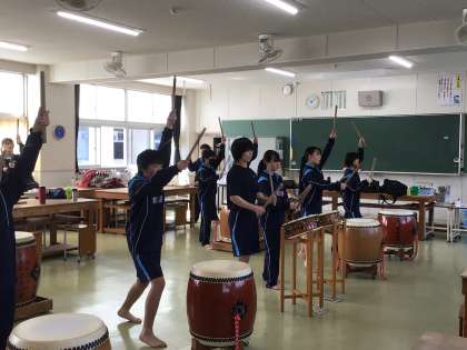 和太鼓部では週末に来てくださる部活動指導者の方のご指導を受けながら、演奏に磨きをかける姿がありました。叩き方や腕の使い方、リズムの合わせ方などのアドバイスを受けてがんばっていました。