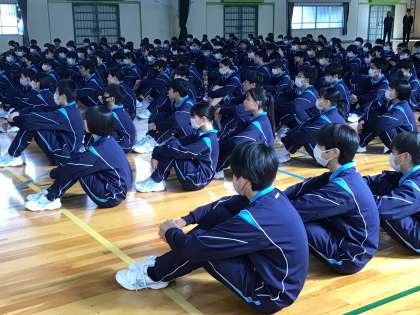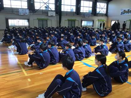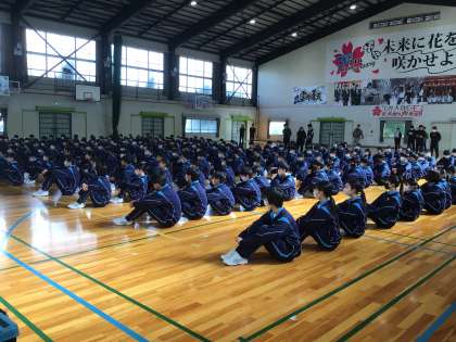 新3年生の生徒たちは、今日までは、まだ2年生のクラスで並んでいます。さっきまで楽しそうに友達と話していた生徒たちも、先生の指示が出るとすぐに話をやめて、話し手にさっと体を向けてしっかり話を聞くことができます。こういうところが末野原中の生徒たちの素晴らしいところだといつも感じます。最高学年として、入学してくる1年生に良い伝統を伝えてくださいね。