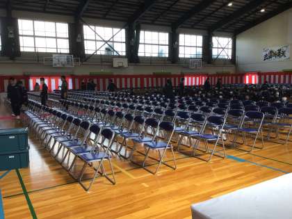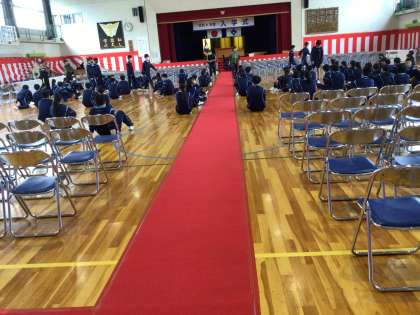 新入生の皆さん、明日の入学式の準備が整いました。明日は担任の先生の先導で、この赤絨毯(赤じゅうたん)の上を皆さんが歩きます。赤絨毯の上を歩けるのは新入生と卒業生だけ。入学時と卒業時の2回だけです。