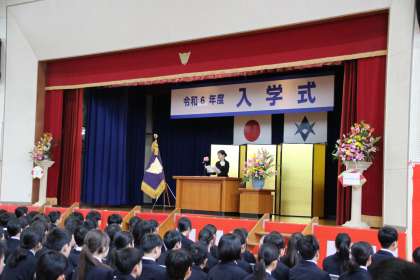 立派だった「新入生代表誓いの言葉」。緊張していたと思いますが、堂々と誓いの言葉を述べてくれました。一番下の写真は、生徒会長のお祝いの言葉の様子です。「僕たちが先頭を切って走っていくので、安心してついてきてください。困ったときは僕たち先輩がいます」と力強く話してくれました。新入生にとって勇気づけられる言葉だったと思います。