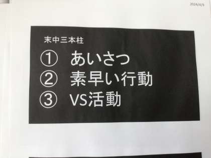 全校集会で示されたパワーポイントの資料の一部です。末中の三本柱の紹介もありました。「挨拶、素早い行動、VS(ボランティア活動)」代々の先輩たちも大切にしてきたことです。挨拶はコロナ禍の影響か少し寂しくなっていると感じます。自分から進んで挨拶、学校の外でも地域の方に気持ちの良い挨拶ができる末中生の姿が示せると素晴らしいですね。