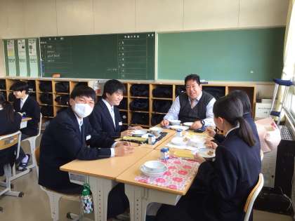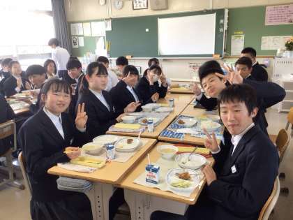 給食の様子です。学校給食は、学習指導要領で「特別活動」のひとつに位置付けられており、「給食の時間を中心としながら、成長や健康管理を意識するなど、望ましい食習慣の形成を図るとともに、食事を通して人間関係をより良くすること」が目標であると書かれています。楽しく、自分の体に必要な栄養素を意識しながら、なるべく残さずにしっかりと食べてくださいね。
